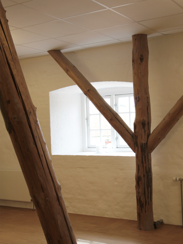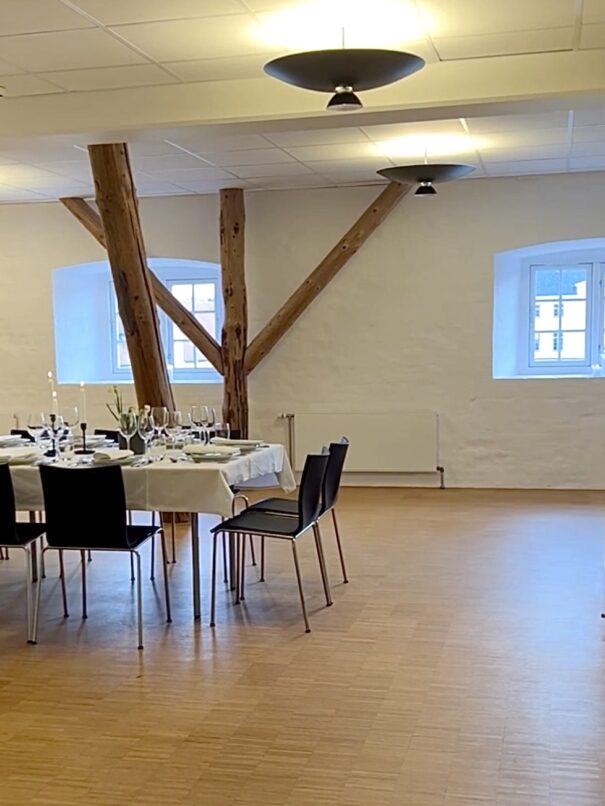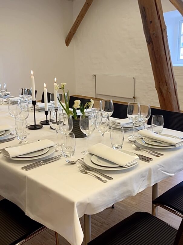 Juels Stue, located in the same building as Stakladen and Kornmagasinet at Aggersvold, is an intimate space ideal for smaller gatherings. The room highlights the building's historic timber structures and offers excellent acoustics as well as pleasant natural light.