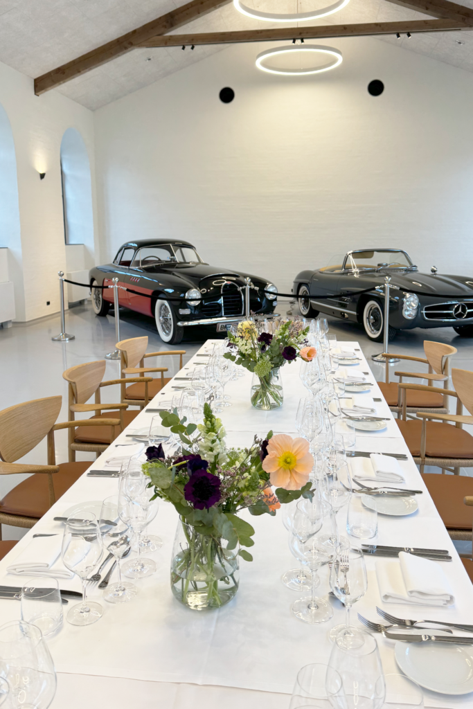 **Maskinhuset** at Aggersvold Estate has a history as a storage space for tractors and machinery used in the estate's operations. In 2023, the building was renovated and has since become a sought-after venue among our guests. With a capacity of up to 150 people, Maskinhuset is suitable for a wide range of events. The room has a distinctive atmosphere, largely influenced by the displayed vintage cars, which add a unique charm. The large windows and spacious entrance ensure plenty of natural light and offer views of both the surrounding nature and the estate's other buildings. Maskinhuset combines historical elements with modern conveniences, providing a flexible setting for meetings, conferences, and other events in a unique environment.