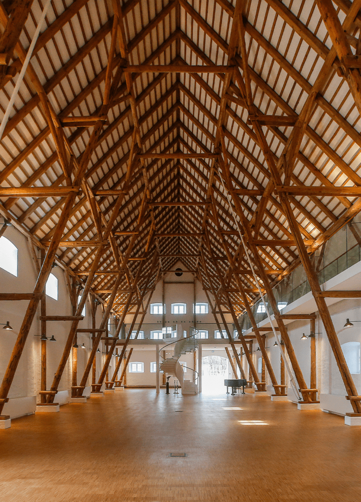 Stakladen, en imponerende moderne multisal, er en af de mest markante bygninger på Aggersvold Gods. Med 14 meter til loftet og spær, der strækker sig fra gulv til loft, tilbyder lokalet enestående akustik og plads til op til 350 gæster. Denne rummelighed og den arkitektoniske kvalitet gør Stakladen ideel til større arrangementer.